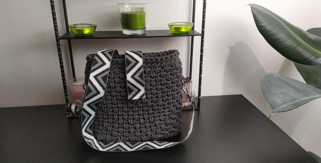 Horgolt válltáska 3 mm pamut zsinórból – fekete bőr alap