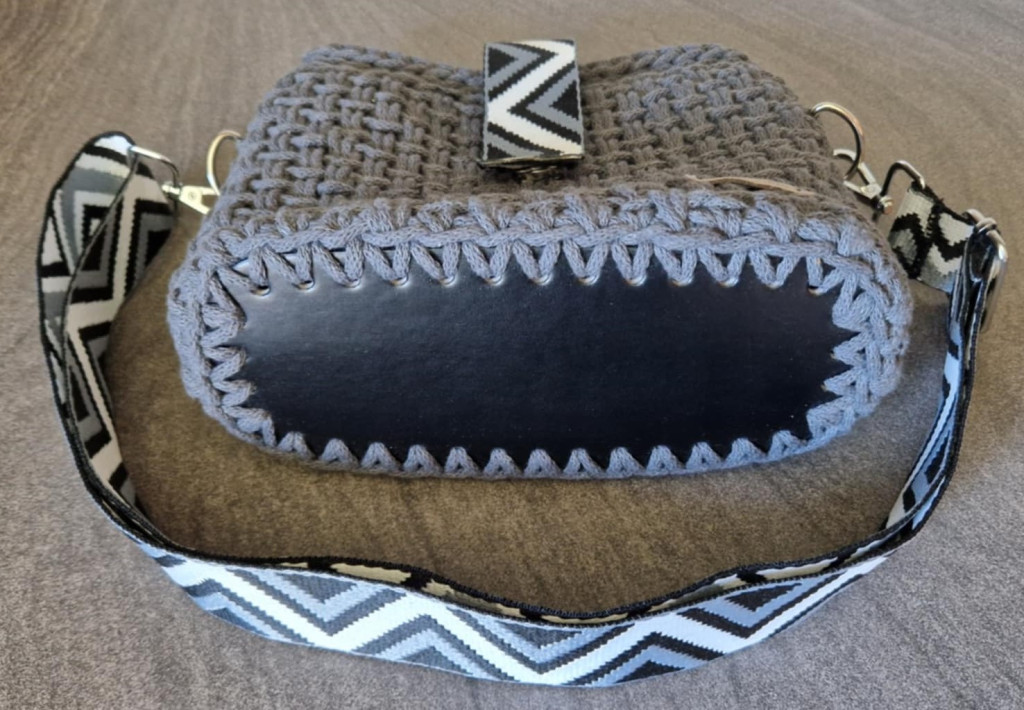 Szín: szürke horgolás, fekete bőr alap, fekete-fehér-szürke mintás vállpánt